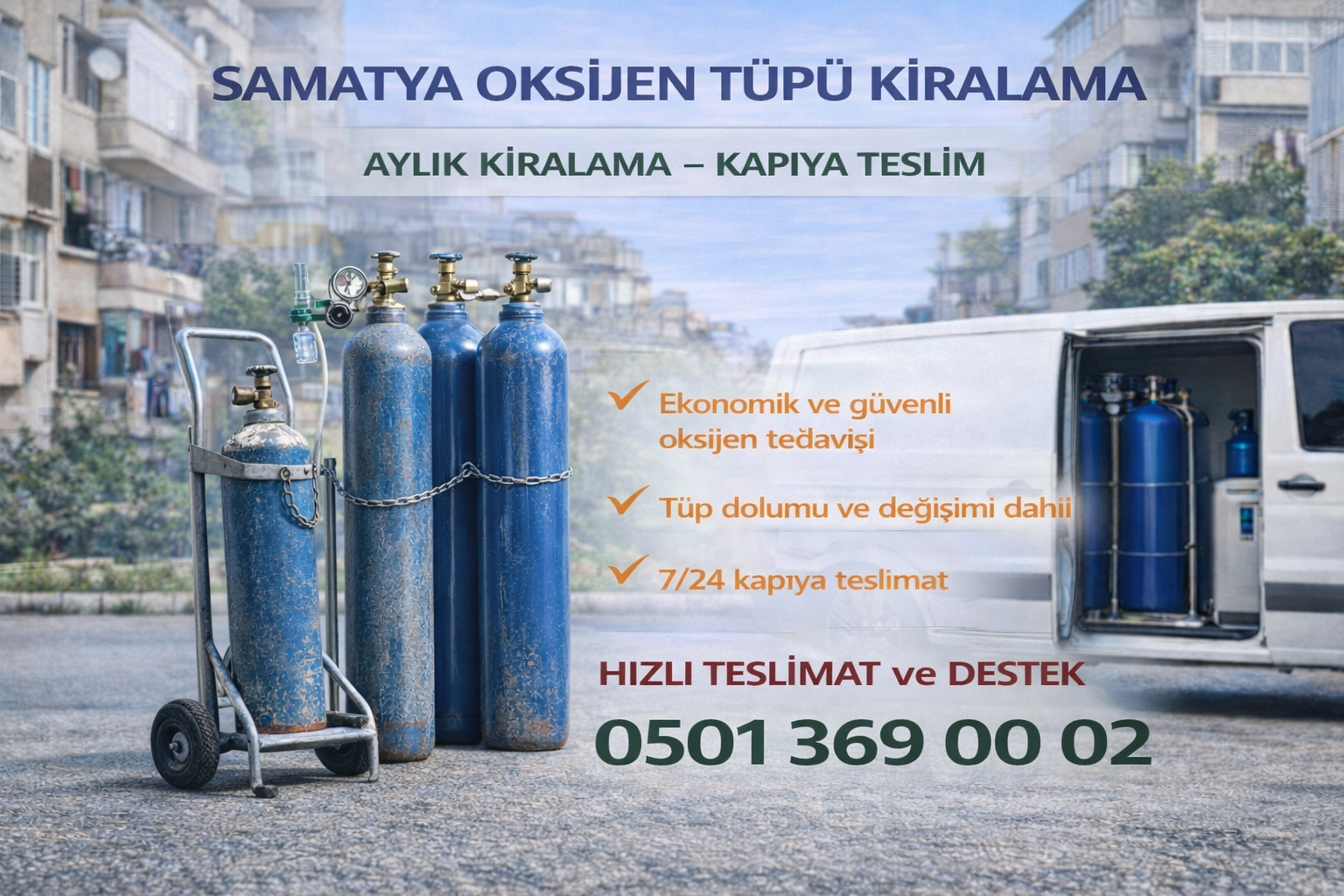 Samatya bölgesinde 7 gün 24 saat oksijen tüpü kiralama ve kapıya teslim hizmeti sunulmaktadır. Acil durumlarda hızlı teslimat sağlanır, kiralama süresi boyunca destek hizmeti devam eder.